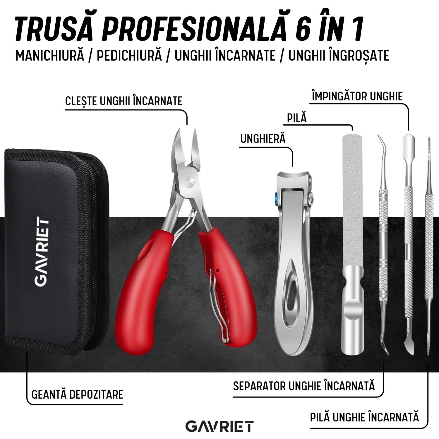 Îngrijirea unghiilor la domiciliu a devenit mult mai simplă și profesionistă datorită trusei **Gavriett™ 6 în 1**, un set compact, dar complet, destinat atât manichiurii, cât și pedichiurii. Fabricată din oțel inoxidabil, trusa promite durabilitate și o utilizare igienică, iar geanta de depozitare o face ușor de transportat și organizat.